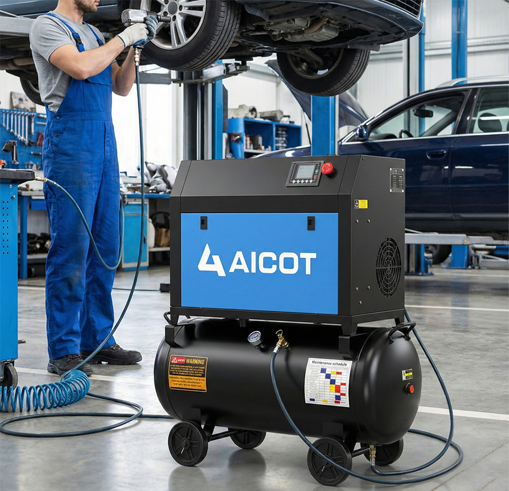 Con tanque de almacenamiento de aire incorporado, 4 ruedas y doble salida, el compresor de tornillo AICOT es sencillo: enchufá y a trabajar.